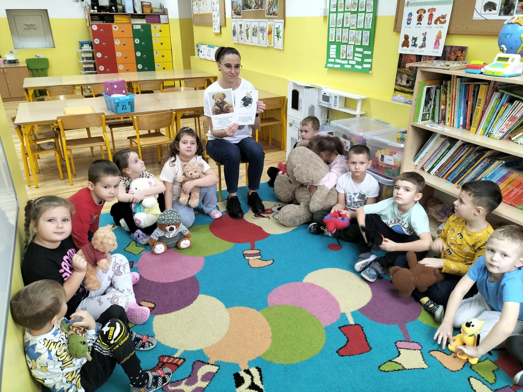 Przedszkolaki zostały zapoznane z historią Pluszowego Misia. Podczas zabawy matematycznej, starszaki utrwalały przeliczanie misiów... Na koniec przedszkolaki wykonały prace plastyczne - wyklejanie misia plasteliną.